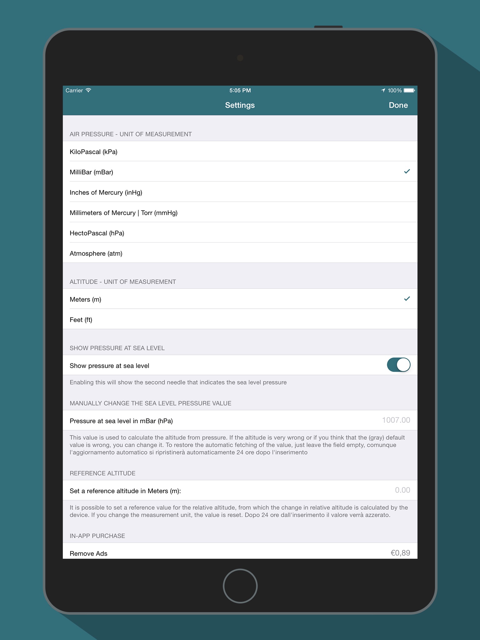 Su iPad mini quattro il barometro cè ma lapplicazione non funziona assolutamente, cera il temporale eppure dava una pressione atmosferica di 997 mbar, un parametro di bel tempo!!!