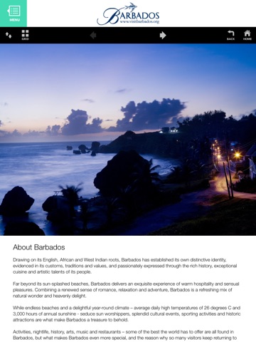 Welcome to our ‘Barbados’ app, a lavishly illustrated, in-depth guide to this tropical island paradise, detailing everything you could want to know both overland and underwater.