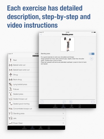 - Every exercise has detailed description, photo and video instruction;
