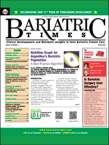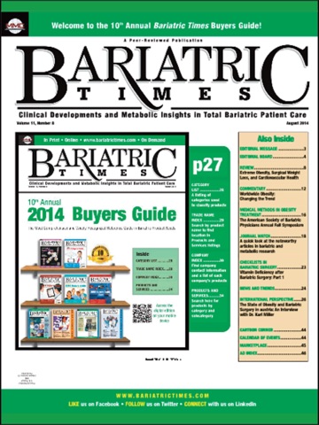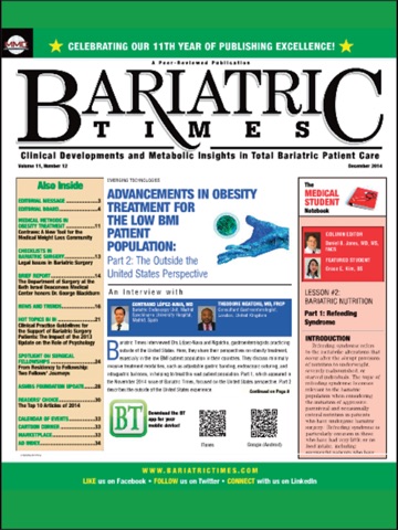 Bariatric Times, a peer-reviewed journal, is published monthly and is is intended for surgeons, physicians, nurses, and other allied healthcare professionals in the field of bariatrics. Bariatric Times offers its readers concise articles from nationally renowned authors and delivers up-to-the-minute information on bariatric trends and developments, the latest clinical and research findings, and current developments in all aspects of products and services utilized in the treatment of obesity and metabolic disorders. Each issue of Bariatric Times offers a wide spectrum of multidisciplinary technologies and insights impacting all areas of bariatrics. In so doing, Bariatric Times has answered the need for a practical bariatric information source with proven results. Bariatric Times is published by Matrix Medical Communications, West Chester, Penn., USA, and is indexed on CINAHL Plus.
