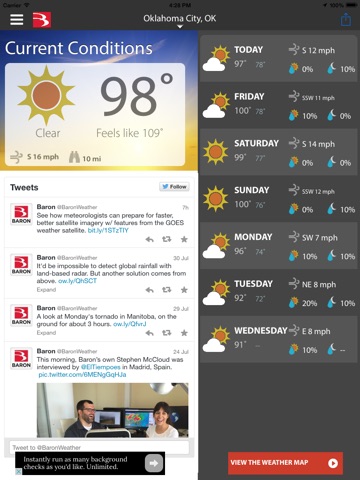 The Baron Critical Weather app is a daily weather resource for your smart phone, providing forecasts and current conditions that include radar, temperature, and surface winds on a fast and fluid map. An easy-to-use interface includes a 24-hour and 7-day forecast, so you can see what the weather will be like at times and locations important to you.