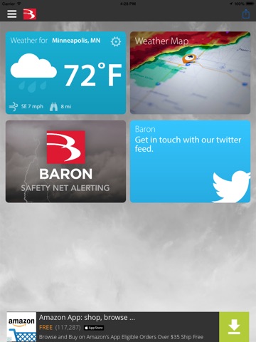Baron Critical Weather provides fully automated weather alerts right on your phone, simple to use and more specific than weather sirens, with a lead time of up to 15 minutes before the storm hits. You can set up to four places to be monitored for severe weather, including your smart phone’s current location, so you always know what’s coming.