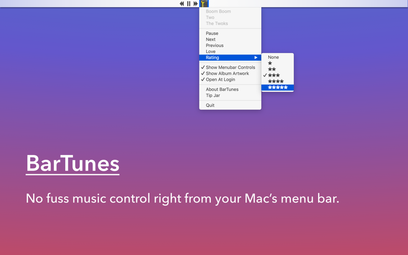 This app works very well. There are three things that could be improved: - If you quit iTunes before quitting bartunes, bartunes automatically relaunch it. This should not happen. - You can’t quit the app from the dock icon, you need to quit from the top menu. Small annoyance. - a volume button would be welcome. Thanks.