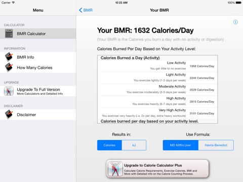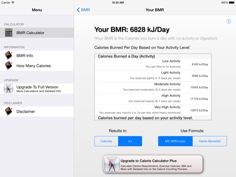 Additionally, the app includes information on how many calories you should be eating a day, what BMR is and how it performs its calculations.