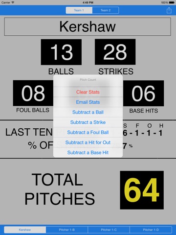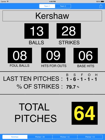 - Conveniently keep track of Balls, Strikes, Total Pitches, Last Ten Pitches, and Percentage of Strikes.