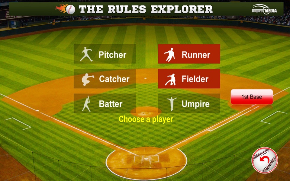 Select a field position and the player involved to get a short set of video baseball rules explanations. Simple as that--no more leafing through a baseball rule-book and guessing at the interpretation.