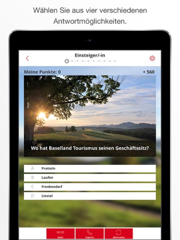 „Baselland Tourismus QuizApp“ deckt die Bereiche Sehenswürdigkeiten, Gruppenaktivitäten, Ausgehen und Tourismusdienstleistungen mit rund 240 Fragen ab. Die fünf Schwierigkeitsstufen reichen vom Einsteigerwissen bis zum Expertentum.