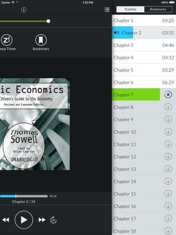 Download your book directly over Wi-Fi or cellular network and begin listening as soon as the first track downloads. The Downpour powered app features an attractive interface with traditional audio controls in addition to sleep timer, bookmarking, and variable track scrubbing.