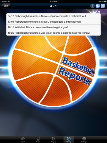Full reports detailing every event of the match are compiled and then you can email the report directly from your iPhone or post onto a facebook fan page. Share with friends, supporters and players with ease. Full statistics are available on all matches, players and teams (Pro Version)