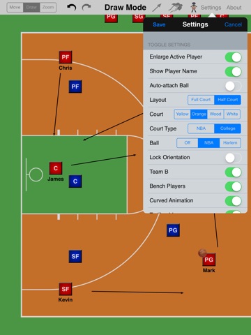 Cant beat this for the price, but it would be a lot more useful if you could set your players up in different spots on the floor. Unless Im doing something wrong, you have to start every play with your players in the same spots on the floor (your PG on the left wing, SF left baseline, C in the paint....). I would like be able to draw an inbounds play, a play with my PG at the top of the key and so on. If someone knows how to do this please post, because then it would be a 4 or 5 star app. @@@Update@@@ This app lacks a lot more than I listed above. You cannot do any of the following that the Devs say you can: Save a play (program crashes if you attempt to do this) Email a play (program crashes if you attempt to do this) Remove the second team from the floor, even though they have an option for it in settings. Start a play with your players where you would like them on the floor. Most of the time the animation feature is useless. Program just freezes over half the time you artempt to use this. In short I would not recommend this program if it were free. I just wish I could get my money back for this POS. I would happily uninstall this.