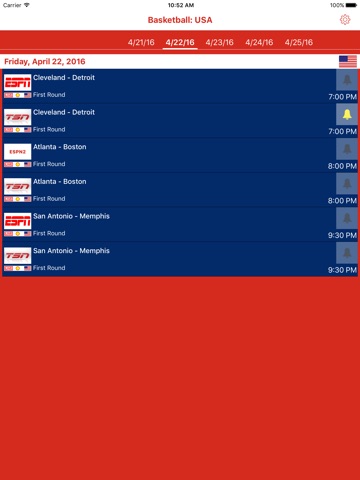 TV program schedule for USA basketball matches with the ability to set reminders for matches that you want to watch. For each match this kind of information is available: is the match is a broadcast in a record, or is it a live broadcast.