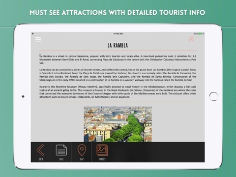 AUGMENTED REALITY, unlike other tourist guides you will be able to discover the city with the best iPhone tool - AR - Just click on the AR button, turn yourself 360° and view on the screen where the best spots are and how to find them. You can also scroll up and down to view the closest and furthest attraction.