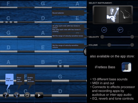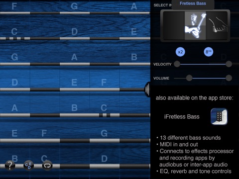 Bass Guitar Free goes into great detail in capturing the experience of playing a real bass guitar with fretless sliding, slap, and fingerstyle sounds, sampled in several layers for each note. It responds to the pressure of your fingers on the screen with subtle and natural sounding changes in the tone of the instrument.