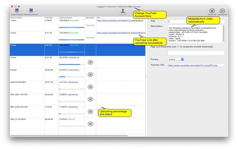 Pros: - very easy to use - works as described - saves many clicks - you can first edit/import all videos, then batch-upload them - video preview Cons: - does not allow to mark all, and add same information to all of them, would be helpfull, especially with „private“-checkbox! Would be nice in future versions: - upload thumbnails (if youtube API allows) - selection of private/not listed or even planned publication (if youtube API allows) - save function, to edit videoinformation and upload later (maybe also to use it to upload same videos to different youtube channels/accounts) - batch list import: for my example i had to upload 300 videos, for which i already had an excel/numbers-table with description, title, keywords, filename and file path on my hard drive) would have been great if i hadn’t to do copy&paste for about 900 times… - multiple youtube account selection for one google-account with more than one youtube-account I think many youtubers, or professional content providers need an app like this, with the above described features. Until now, I don’t know any app, which provides this features. Maybe „Batch Uploader fo Youtube“ could be the first and offer a PRO version, with even more features. We’ll see. So here are 4 stars from Germany.