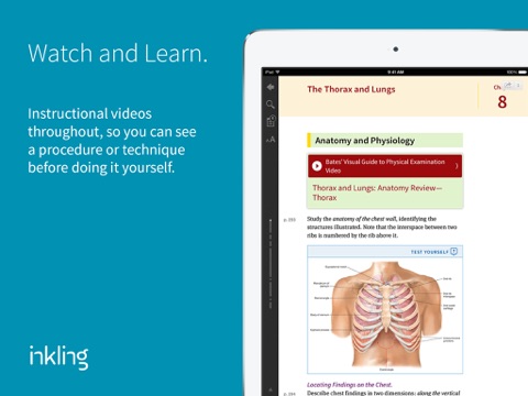 Optimized for each device, Bates on Inkling includes multimedia like instructional videos and audio clips that bring concepts to life, while figures and concepts are linked for easy reference. Test your knowledge everywhere in the text with end of chapter quizzes, interactive diagrams and margin pop tips that show and hide examples of abnormalities.