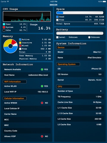 他の方も言われていますが(無料版の方の 2015-10-20)、メモリー表示の値がおかしいです。 例えば、iPad mini 2 で Active=1.74GB, Inactive=280MB, Wired=770.5MB, Free=703.4MB、そして Total=3.46GB となっています。(iOS 9.2.1) この機種はメモリーが 1GB のはず。 あと iPod touch 6 も同様におかしいけど、iPad air 2 はまともな値になります。