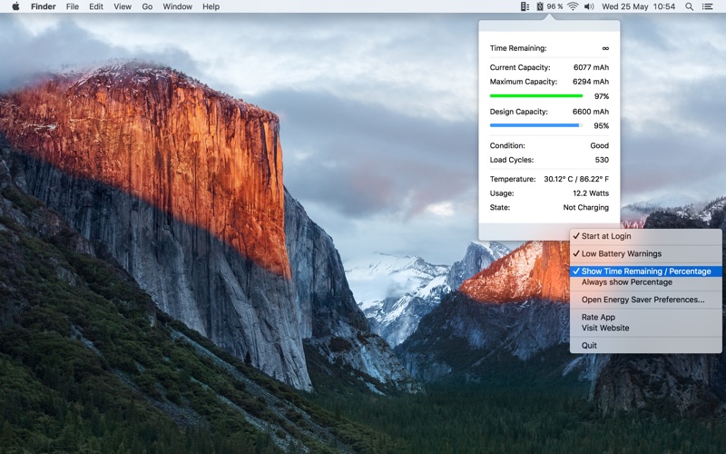Battery Time & Stats will show remaining battery life time in the menu bar, whenever your battery is discharging. Optionally percentage can be shown. While charging it shows percentage.