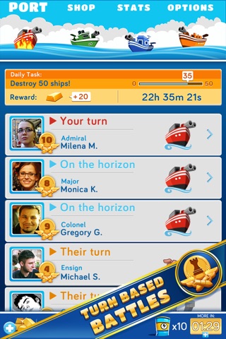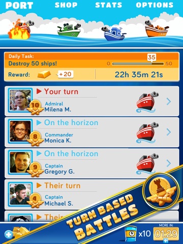 Challenge your friends to a sea battle! Play with friends or defy a random opponent and set the sea on fire in this stunning reimagining of a beloved classic! It’s easy to get started. Just connect with Facebook to find and play with friends! You can also invite buddies by Twitter, SMS or email!