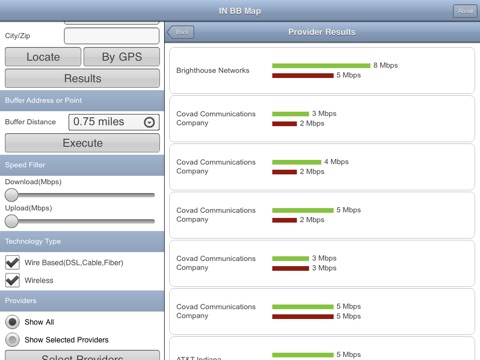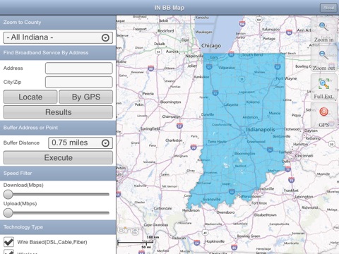The IN BB Map is a mobile application that provides information about the location of broadband service in Indiana. Search by address or “pin” a location on a map to learn about service providers, advertised speeds, and type of technology used to provide service to a specific area. The data supporting this application is updated twice each year, spring and fall.