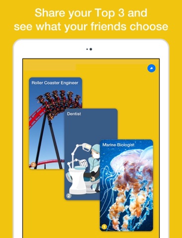 Tap to learn facts like salary and how long you have to spend in school. If you are really passionate about a career, crown it! Then share your Top 3 with your friends and see what they choose.