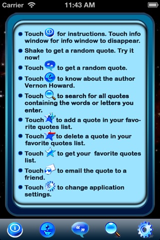 Engaging animation and graphics including stars and planets movie, ripple effect on random quotes screens and page turning effect when paging through multiple quotes from favorite or search lists