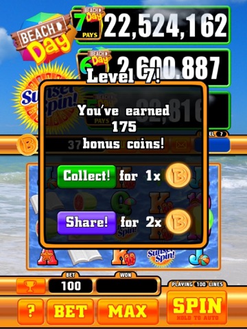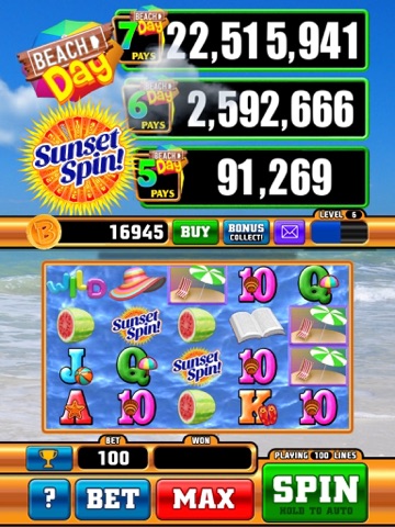 In Beach Day Slots, enjoy a relaxing day at the beach with a high quality Slot Machine experience! Get ready to spin the Wheel in the Sunset Spin Bonus Game, win giant progressive jackpots and play daily, weekly and monthly tournaments vs. players from around the globe!