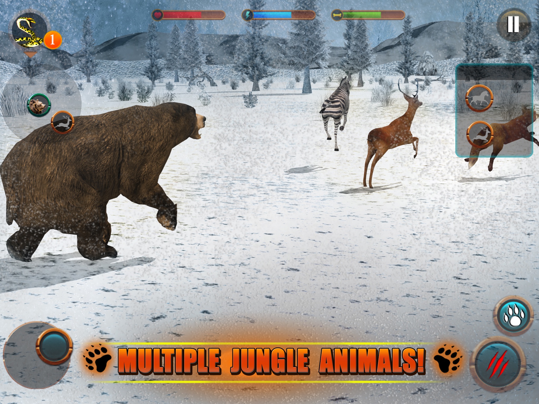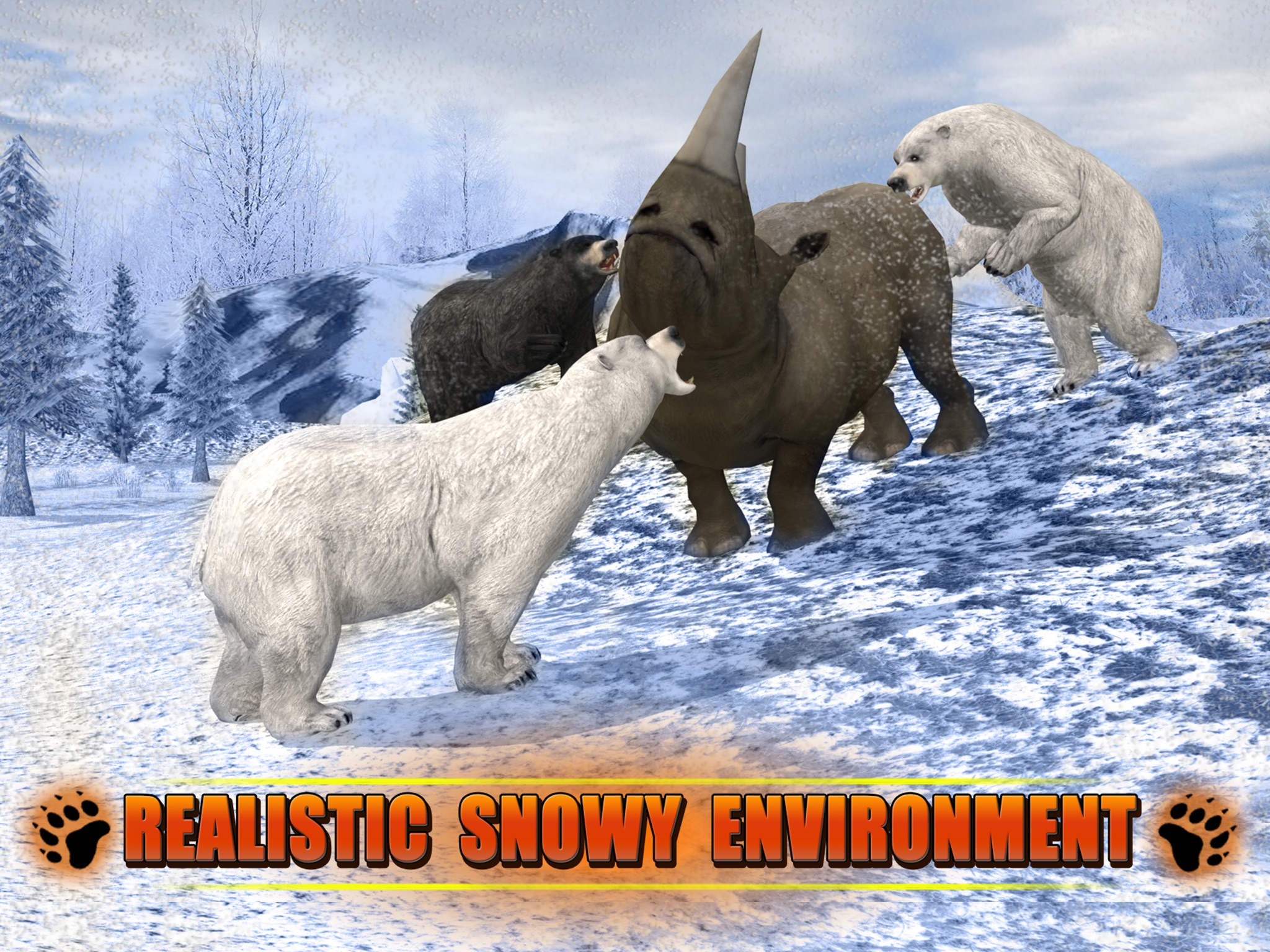 Get into the skin of a burly WILD bear! Shake the forest with your gigantic presence by roaming around in the snowy terrain and foraging for food! Enjoy winter hunting! Use your bulky form and strength to fight a motley crew of animals like lion, rhinos, and snakes. You may be big, but don’t underestimate their prowess. Use smooth attack and survival controls in this realistic simulation of just a slice of the animal world. Complete the given quests to do it all over again; buckle up for your next adventure--rather--sharpen your teeth! (Seriously, aren’t you glad you’re not playing this as a human?)