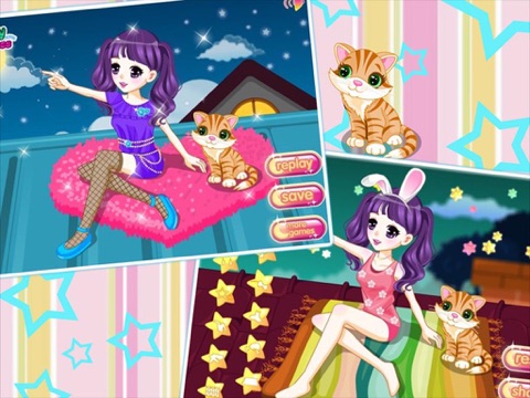 the little girl and her little cat is sitting on the roof and counting the stars,she is pointing to the stars in the sky and identify constellations: Aries, Libra, Taurus. . .