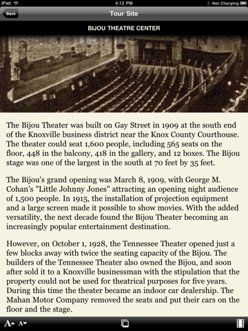 The tour features 13 historically and culturally significant sites in and around downtown Knoxville. While at or near each site, the app enables users to read brief narratives about the site’s importance and view photos of notable people, neighborhoods, and events in Knoxville’s history. Adding to the uniqueness of this application, tour participants can view 4-6 minute videos about the historic and cultural significance of 10 of the 13 sites.