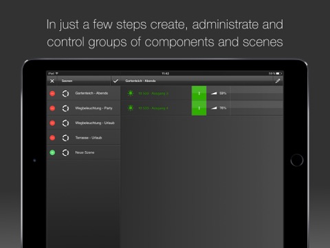 Devices can also be grouped together and incorporated into scenarios of your choosing. With the push of a button you will experience the perfect feelgood atmosphere or the ideal working environment.