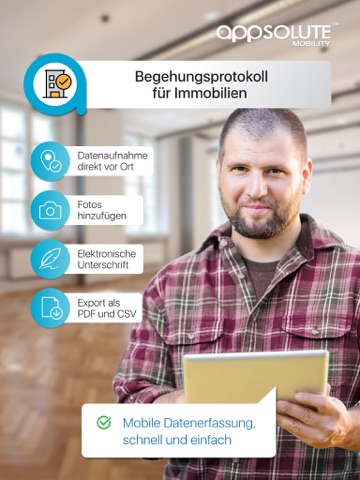 Diese App von APPsolute Mobility richtet sich an Immobilien-/Haus-/Gebäudeverwaltungen. Sie beinhaltet eine Standardvorlage zur mobilen Erfassung der Daten von Begehungen. Optimiert für die Nutzung auf Tablet und Smarthone.