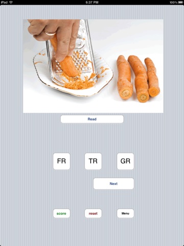 Quiz Mode: Test your knowledge of the beginning blends. Students are shown a picture with a "Read" button (to read the word if the picture is unclear) and a choice of three possible beginning blends. Do as many or as few questions as you want. Questions are randomly chosen. Score can be viewed or reset at any time.