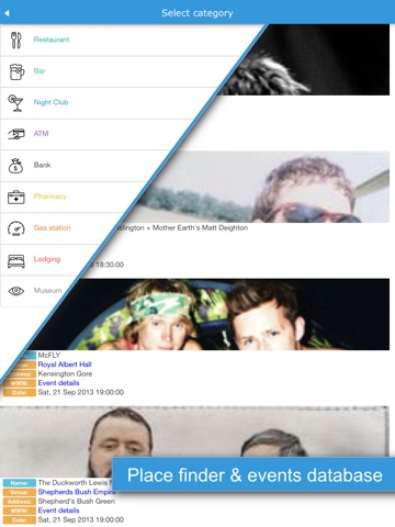 App will find nearby: Restaurant / Bar / Night club / Lodging / Hotel / Museum / Pharmacy / ATM / Bank / Gas station