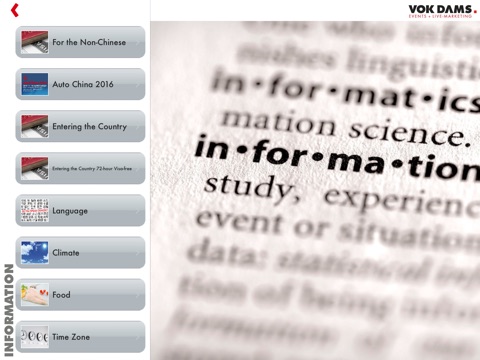 Aside of the information and checklists the VOK DAMS Beijing City Guide allows you direct access to Google maps including route planning and an extra button for the Chinese address.