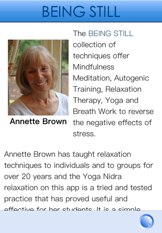 The Yoga Nidra relaxation is also available as one of a complete collection of Annette Browns 5 Being Still relaxations on the Being Still App, the others being: