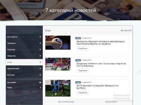 Новости в приложении отсортированы по времени публикации и разбиты по следующим рубрикам: