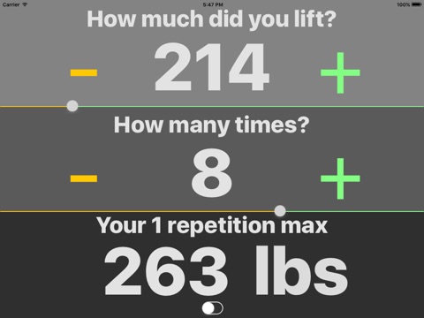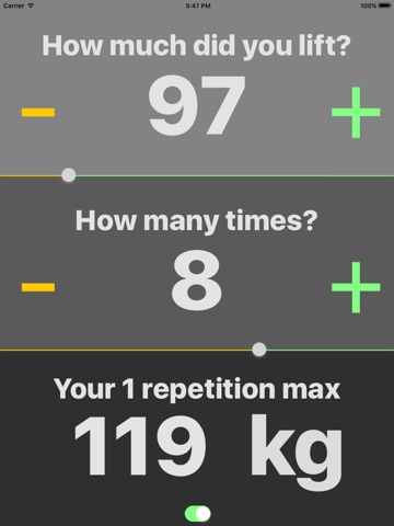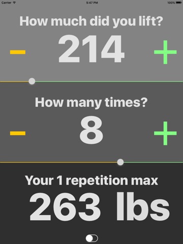 Find a weight that you are comfortable with and simply type in how many repetitions you completed. The app then estimates your one repetition maximum (1RM)
