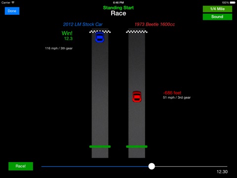 Select a second vehicle or configuration, and watch them race up to 2 miles in real time!