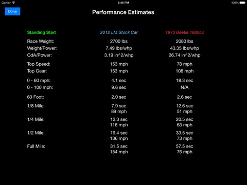 Disclaimer: Please note that it cannot account for all variables or conditions, and that some assumptions are being used. Therefore, it may not represent exact real-world performance or vehicle characteristics. The vehicle data included with this app is intended as a starting point, and represents estimates based on basic research. This product is not affiliated with, or endorsed by, any vehicle manufacturer. Any brand or vehicle names are trademarks of their respective owners.
