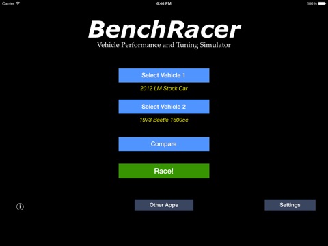 With BenchRacer, you can enter your own real vehicle data, modify it as you like, and easily estimate the resulting performance stats: 0-60 mph, 0-100 mph, top speed, 1/8 mile, 1/4 mile, 1/2 mile, and full mile times and trap speeds, and more. Also supports metric units and race lengths.