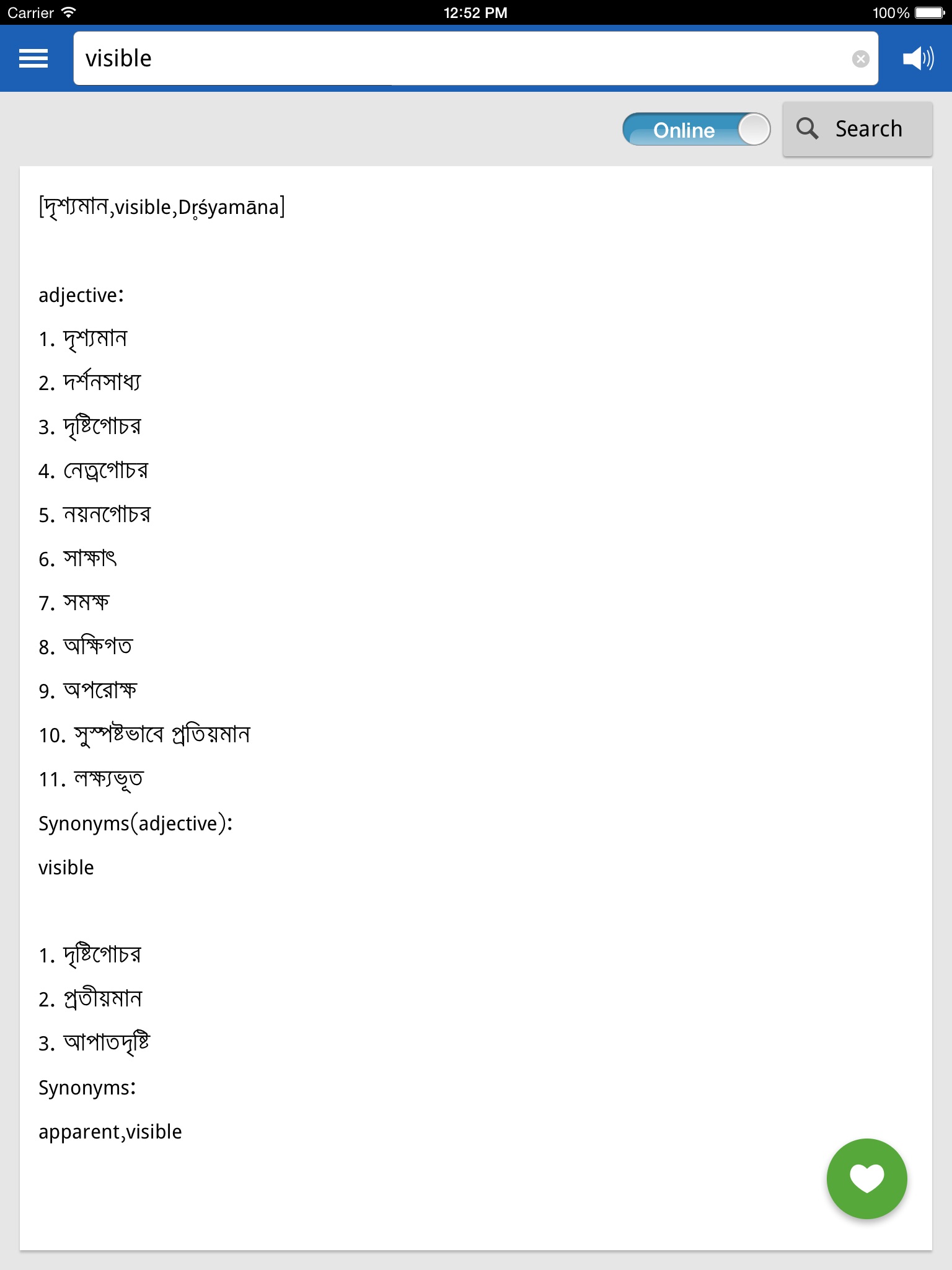 The vocabulary is constantly being updated. It has both online and offline options, choose whatever option you wish. Online option will give you access to tons of words with detailed meaning.