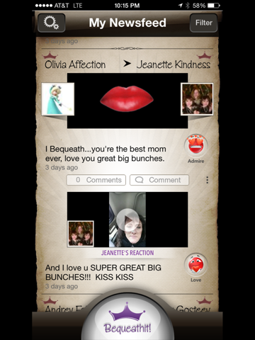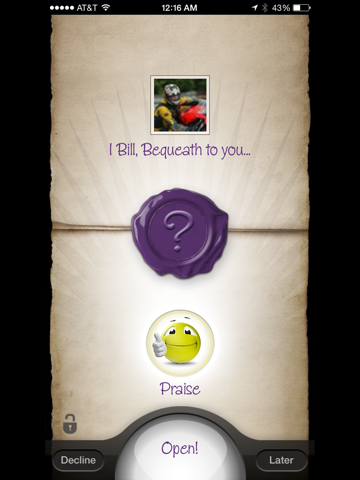 Behold! – Social media finally has a soul. Connect with your friends, family, or acquaintances on a deeper level with BEQUEATHIT. Whether it be a special occasion or random act of kindness, now you can bestow videos, pictures, and messages with more meaning. BEQUEATHIT uses a revolutionary interactive emoji, allowing you to express the perfect sentiment like never before. Would you like to see how people react to what you send? Reactions are captured on video as it’s being opened, so those candid moments can be experienced together and relived.