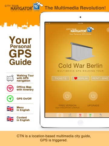 The GPS guided city exploration App takes you to Checkpoint Charlie, the place where the Cold War almost became the Third World War, also the Berlin wall, and Third Reich, (Potsdamer Platz) the new center of Berlin.