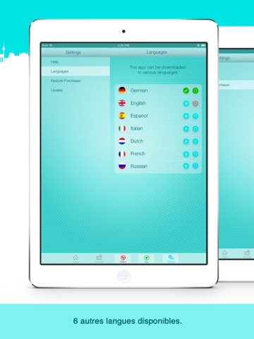 Lapplication est en 7 langues: français, anglais, espagnol, italien, allemand, néerlandais et russe.Vous obtenez votre application dans la langue de votre identifiant Apple-ID. Par exemple : Si vous êtes inscrit dans le iTunes Store français, vous obtenez lapplication en français. Les autres langues peuvent être acheté dans lapplication même.