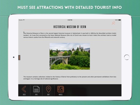 Tourist info for must see attractions such as Münster of Bern, Historical Museum of Bern, Federal Palace of Switzerland, Zytglogge, Kornhausplatzs, Kindlifresserbrunnen, Einsteinhaus, Bern Railway Station, Spitalgasse, Pfeiferbrunnen, Church of the Holy Ghost, Swiss Alpine Museum, University of Bern, PostFinance Arena, Zentrum Paul Klee, Untertorbrücke, Nydeggbrücke, Bärengraben, Laussane, Lucerne, among others.