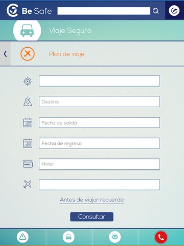 APP Mobile que permite a la fuerza de ventas visualizar y consultar temas relacionados con seguridad corporativa y precauciones a tener en cuenta en alguna zona geográfica determinada, siendo esta el complemento ideal para mitigar los riesgos a los que están expuestos en el desarrollo de viajes corporativos. En esta aplicación podrás consultar alertas de tipo informativo y seguridad, consultar tu plan de viaje y visualizar sobre un mapa la ruta sugerida, comunicarte con las centrales de seguridad de la compañía ya sea por correo y vía telefónica.