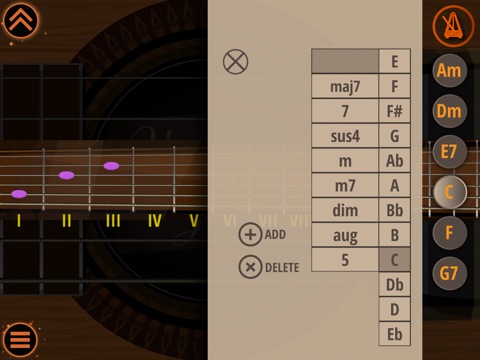 - 12 chords (maj, maj7, maj7+, min, min7, sus4, dim, aug, power chord)
