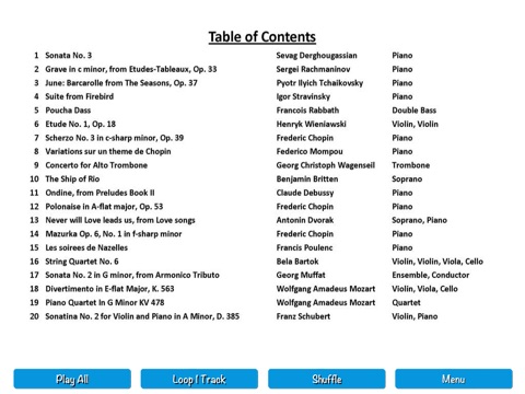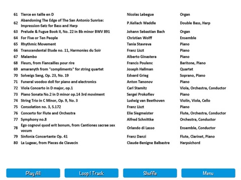 This App contains 80 sound tracks of famous classical music that can be listened at your convenience.