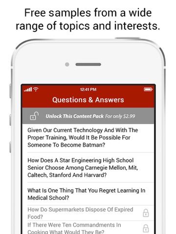 The questions and answers included in this app are from over 100 of the very best questions and answers across 18 different categories (Food, Education, International, Law, Life Advice, Literature, Music, Professions & Careers, Science, Movies & Television, Politics, Prison Life, Sports, Technology, Women, The United States, Work Advice, and Personal Experience) are featured.