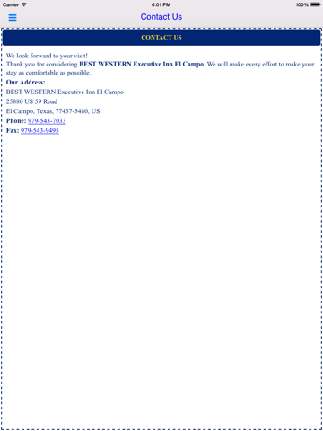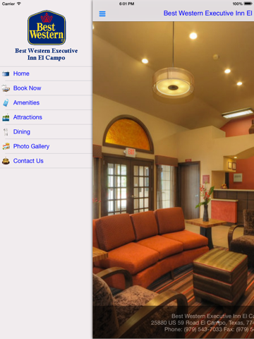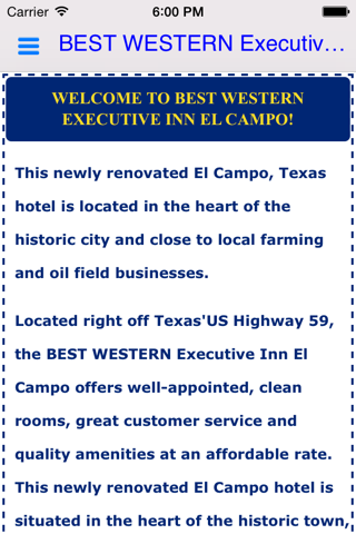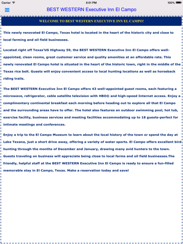 BEST WESTERN Executive Inn our Hotel in El Campo TX is a economically priced Hotel offering comfortable accommodations to business travelers and Families travelling to El Campo. For the very best value in El Campo TX , it’s the Best Western El Campo, a clean, comfortable hotel you’ll like from the very first moment. You can connect with this hotel easier and more conveniently than ever before using this single property app from Bingo Travel Apps. Booking is simpler than you ever thought possible -- right from you smart phone! You can also read over features and amenities and see accurate, convincing photos of this property as well. With this app, the hotel is always at your fingertips -- and always available at the best possible price. Download the app right away.